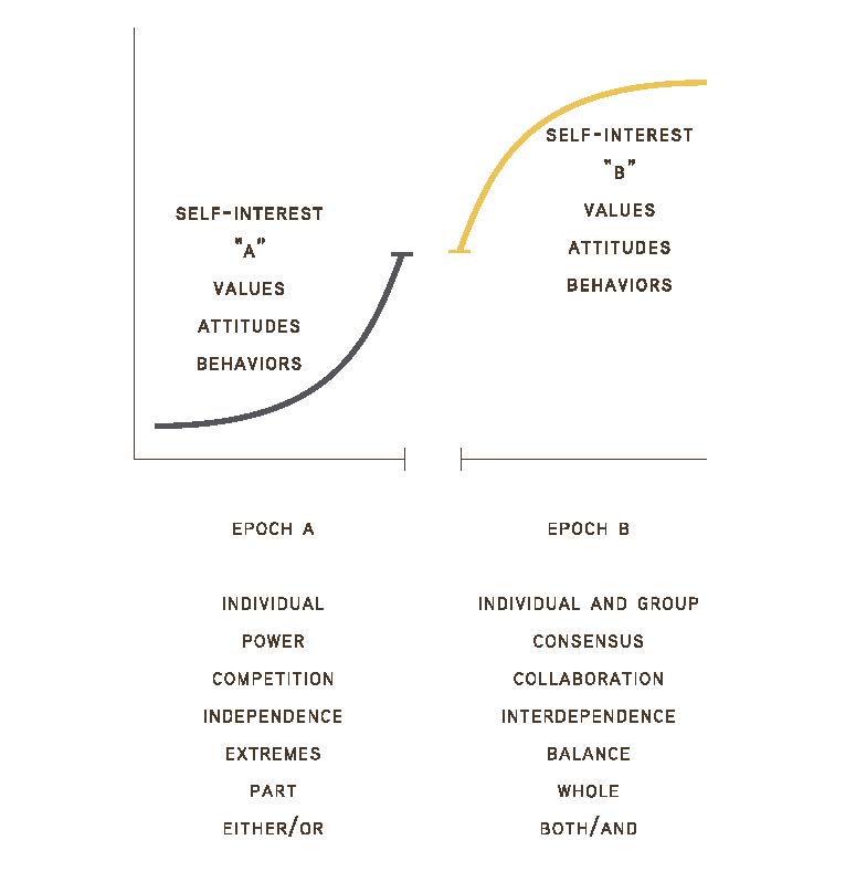 JS: It’s a very visual concept based on an S-shaped growth curve. The basic idea is that, after centuries of accelerating population growth, we are entering a different era. As we do, we need to adapt to different conditions, particularly conditions of limitation and slowing of growth in population. In doing so, there is a necessary and desired shift in values, attitudes and behaviors. It has become clear in the past 30 to 40 years that resources and the ability to dispose of waste that once seemed totally unlimited, are not. We are hitting those limits and need to make adaptations. Those adaptations include going from competition to cooperation, independence to interdependence, constant growth to a state of equilibrium, and going from an “either/or” philosophy to a “both/and” philosophy. Those are the major shifts that happen right around the point of inflection in the population growth curve.